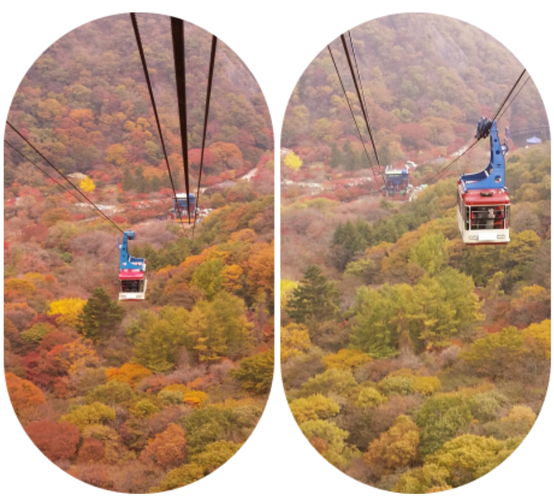 등산이 아니라 단풍이 목적이라면 케이블카를 타면 돼요. 지상에서 연자봉 중턱 540m까지 단 5분 만에 오를 수 있거든요. 발아래 넘실대는 오색 단풍에 잠시도 시선을 떼기 어려울 거예요. 케이블카에서 내려 10분만 걸으면 전망대가 나와요. 우리나라에 있는 거의 모든 단풍의 색감을 볼 수 있는 전망 포인트죠.