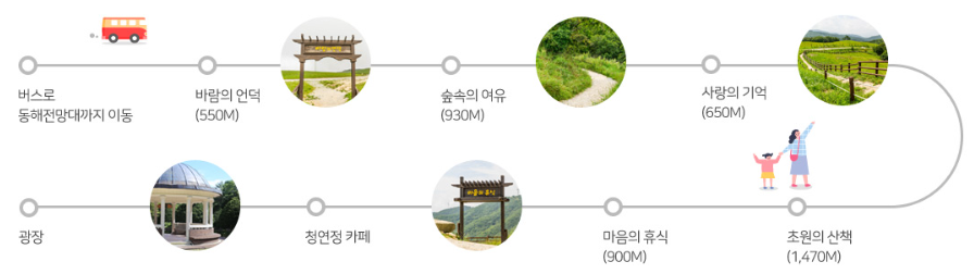 총 5개 구간 4.5km를 온전히 걸어서 이동하며 대관령의 여유를 느낄 수 있는 코스입니다.