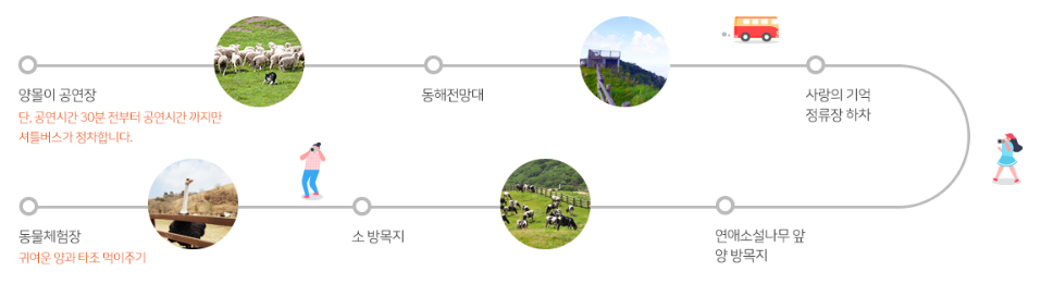 양과 보더콜리가 펼치는 양몰이공연, 귀여운 송아지에게 우유주기 등 다양한 동물체험 위주 코스로 어린아이 동반 가족에게 적극 추천합니다.