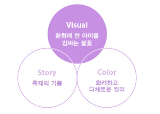 어린이의 관점에서 축제의 경이로움을 포학하여 엠블럼 중심의 모습을 담아 축제를 관람하는 순간의 기쁨에 휩싸여 있는 상황을 묘사합니다. 다양한 모양과 화려한 색상으로 자유롭게 하늘을 수놓는 불꽃의 형태와 컬러를 재해석, 다양성과 자유분방함, 열정을 담았습니다.